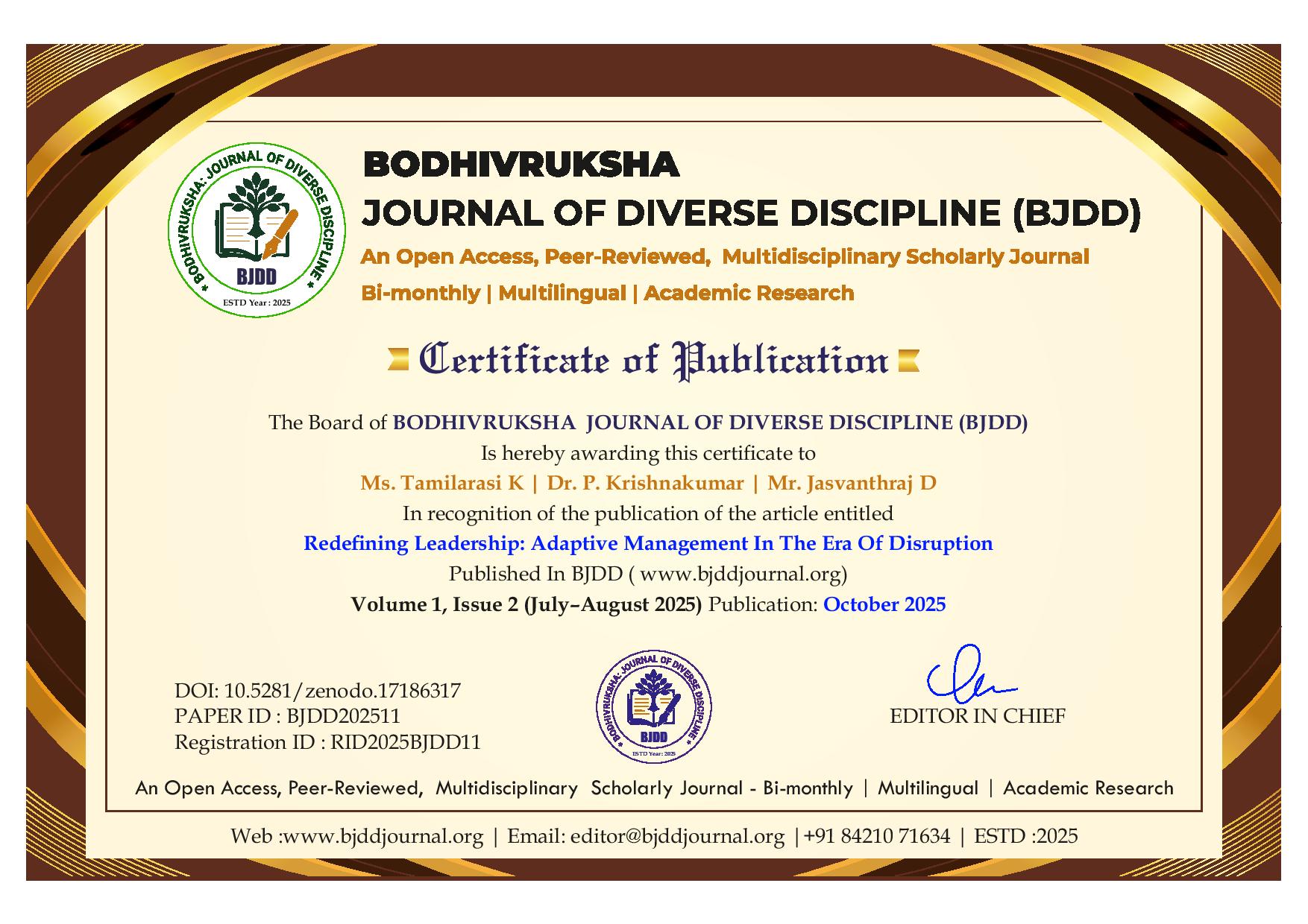 The 21st century has ushered in an era of unprecedented disruption, characterized by technological innovation, climate change, global pandemics, and volatile market dynamics. In this context, traditional top-down leadership models are proving insufficient. This chapter, "Redefining Leadership: Adaptive Management in the Era of Disruption," explores how adaptive leadership and agile management practices are becoming essential tools for organizational success. Drawing on contemporary research and real-world case studies, the chapter delves into how resilient leadership, systems thinking, and change management can equip leaders to respond effectively to evolving challenges. It emphasizes the importance of emotional intelligence, collaborative leadership, and decentralized decision-making in creating flexible, responsive organizations. Special attention is given to the role of digital transformation and data-driven strategies in enhancing adaptability.