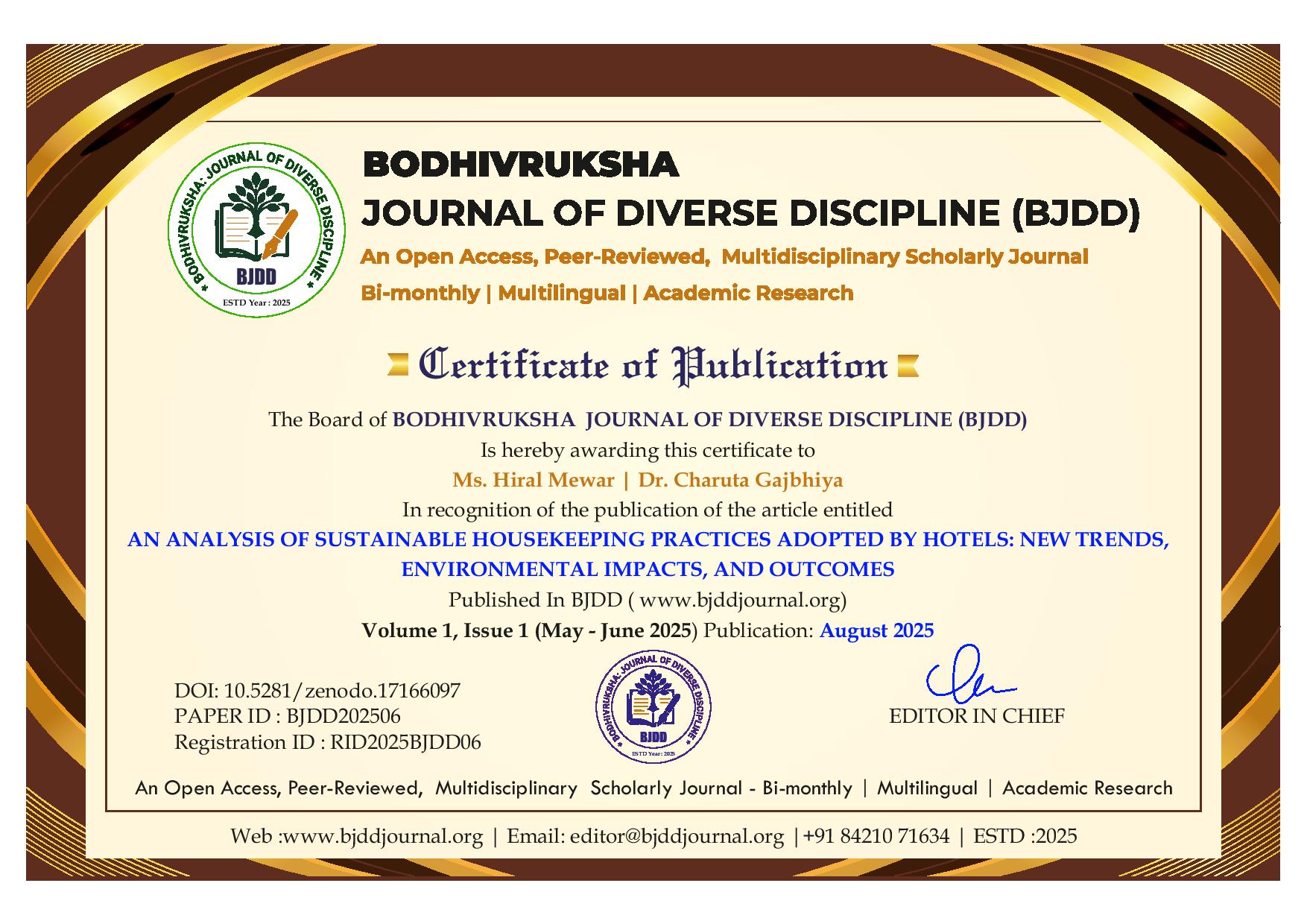 This research examines the adoption and implications of sustainable housekeeping practices within India’s hospitality sector, with a focus on environmental stewardship, operational efficiency, and guest engagement. Through a systematic review of academic literature (2018–2024) and analysis of sustainability reports from leading hotel chains—including Taj/IHCL, ITC, and Oberoi—the study identifies transformative trends such as water-efficient technologies, waste diversion systems, and eco-friendly cleaning methods. Key findings reveal that hotels implementing ozone laundry systems reduced hot-water consumption by up to 80%, while greywater recycling and linen reuse programs decreased per-guest water usage by 15–27%. ITC Hotels achieved near-zero organic waste through large-scale composting, diverting 99% of food waste from landfills. Despite these successes, challenges such as high upfront costs for advanced technologies and staff training gaps persist, slowing industry-wide adoption. The study highlights the dual benefits of sustainable housekeeping: significant reductions in resource consumption (20–30% energy and water savings) and increased brand loyalty among eco-conscious travellers. Practical implications highlight the need for policy incentives, standardized certifications, and stakeholder education to accelerate green transitions. By bridging academic insights with operational data, this research provides a roadmap for hoteliers to align sustainability goals with economic viability, positioning India’s hospitality sector as a leader in environmentally responsible tourism.